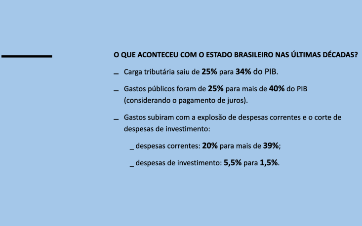 Nesse sentido, defende que o País necessita, com urgência, de uma Reforma Administrativa que tenha a propriedade de aumentar a qualidade do gasto público. Como exemplo, ele contrastou a diferença de eficiência vista no principal órgão de arrecadação — a Receita Federal —, em comparação ao INSS, em relação a despesas. “São eficiências completamente diferentes, a da arrecadação é muito superior.”